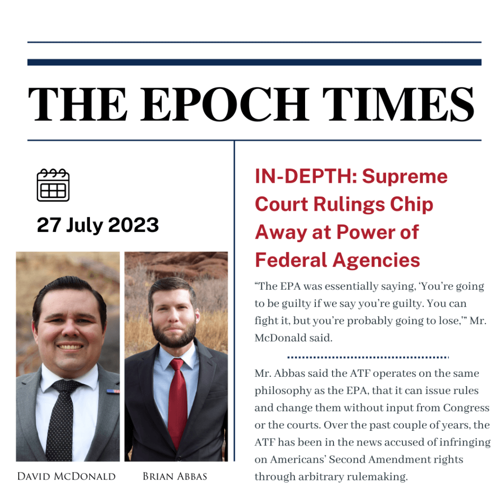 MSLF attorney David McDonald and Director of the MSLF Center to Keep & Bear Arms Brian Abbas were just featured today in an article by the Epoch Times in which they discuss how “Supreme Court Rulings Chip Away Power of Federal Agencies.” We are proud of both of our attorneys for this feature and the insights they share into the overreach of federal agencies and how the recent Supreme Court term has begun to put the agencies back in their place.