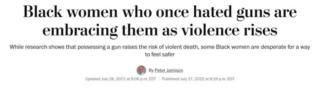A strange tone was also struck by Peter Jamison’s recent Washington Post profile of newly-armed black women. Straight away, you can see a combination of respectful listening and condescending arrogance. The headline is fair—“Black women who once hated guns are embracing them as violence rises.” But the toxic condescension begins in the subheading: “While research shows that possessing a gun raises the risk of violent death, some Black women are desperate for a way to feel safer.”